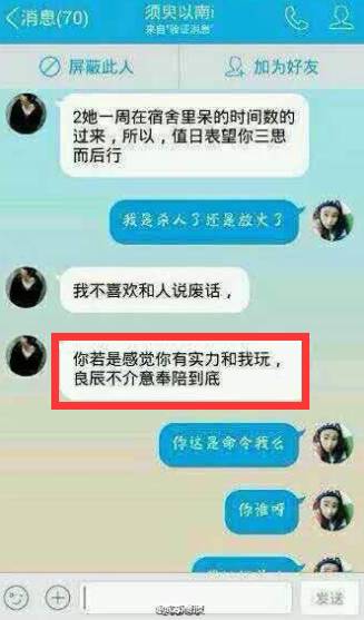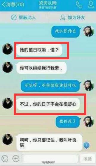 大家可以看到,葉良辰和宿舍長的聊天記錄中,先有威逼,后有利誘,所謂軟硬兼施,最后令宿舍長竟無言以對。