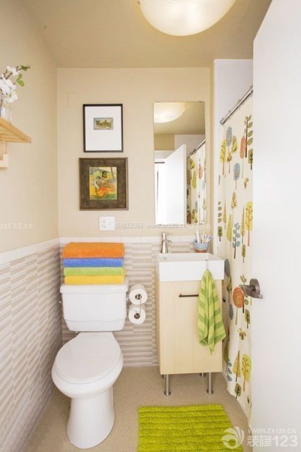 三、清爽的色彩總是能提升空間的亮麗度。狹長的衛浴空間放下座便器以及小巧的臺盆剛剛好,一邊攔出一個小空間,掛上簾子就是淋浴區了。墻角的空間完美的劃分成了淋浴區,一旁放置的收納柜以及墻上的收納架都很好的將小空間利用了起來。