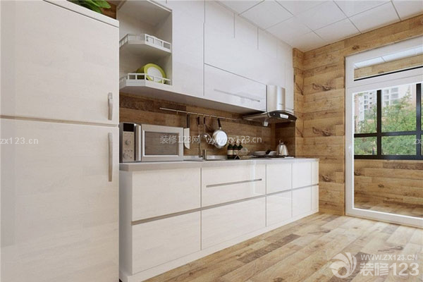 廚房以白色為主要色調,地板紋理的瓷磚搭配白色的櫥柜,看起來干凈整潔,配以綠色的植物和餐具,仿佛身處原生態的大自然當中,做飯的時候簡直是一種美好的享受。