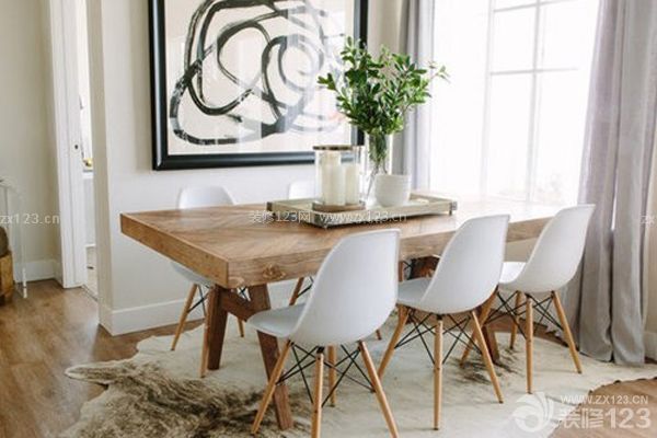 厚重的實木餐桌顯示出其獨特的魅力,伊姆斯椅與之十分相搭。簡單卻又厚重的餐桌既擁有原木的自然親切又具備了沉淀韻味,背景墻裝飾著抽象的藝術掛畫,讓簡約空間也擁有觀賞感。