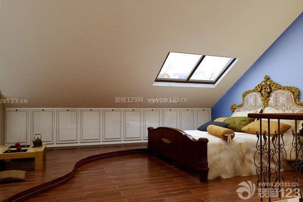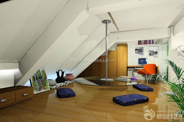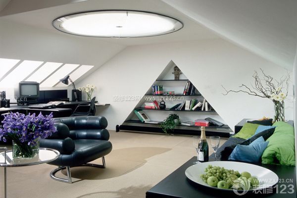 頂層的坡屋頂和別墅的小閣樓,都會有多處斜面建筑,如何利用改造它也是一門學問。通常,仰視三角形的屋頂會讓業主情緒緊張,惟一的辦法就是削弱它的壓抑感。設計師一般會將一些靜態的活動安放在這種局促的空間。依照這種原則,可將斜屋頂下安排為安靜的工作間或是書房,或是一個靜靜欣賞音樂的音樂屋。也可以做成一間小小的廚房,但傾斜的坡度要能保障使用者自如地活動。如果特別低矮的,只能做出一些小格子來,將書報、CD、玩具等瑣碎的物品統統收納儲存起來。