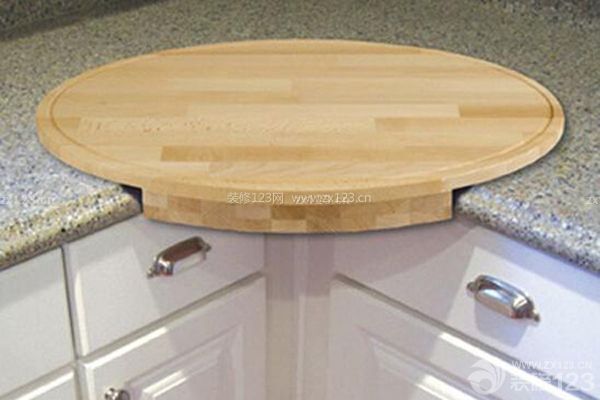 將櫥柜拐角的收納區(qū)全盤轉(zhuǎn)換為操作臺(tái)是一個(gè)乾坤大挪移式的死角解決法,可有時(shí)候成套櫥柜已經(jīng)做好了,要改費(fèi)時(shí)費(fèi)力費(fèi)工錢,還有機(jī)會(huì)挽救么?小編覺(jué)得,稍稍補(bǔ)救的機(jī)會(huì)還是有的,比如說(shuō),拐角臺(tái)板上配一個(gè)活動(dòng)砧板,一防撞,二可以在切菜時(shí)利用拐角來(lái)穩(wěn)定砧板。