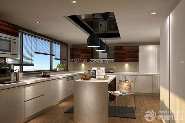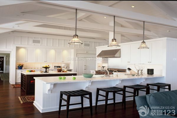 1、開放式廚房可以充分利用空間。利用地柜與吊柜的空間的墻面,安裝擱架,可以放置消毒柜微波爐或安裝擱板、掛鉤、杯、調料瓶、鏟子、勺子等,這樣就避免了它們占據櫥柜臺面。