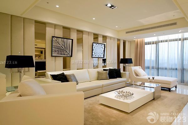 如果客廳的采光度不佳,兩墻面距離短,那么可以試試反光材質的運用,不僅可以很好的折射光線改善采光,還可以營造更大的視覺面積。如果采用鏡面+掛畫+投射燈的設計,能營造出3種層次感,一是投射燈投射在反光玻璃上,減少吊頂的壓抑;第二,亮色的現代掛畫聚焦視覺中心;第三,沙發頂部反光玻璃,通過反射作用增加視覺縱深。