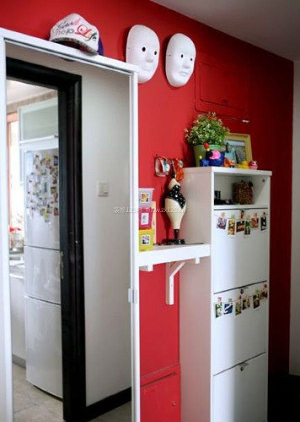 白色的鞋柜,兩個鞋柜本來計劃是并排放在一起的,但由于需要固定在墻上,這面墻后面是有線電視的線,所以最后就采取了在兩個柜子中間加一塊擱板的辦法來折中了。