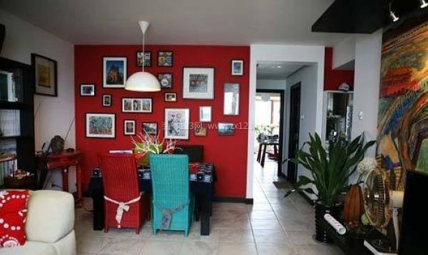 站在窗戶旁拍用餐區,從玄關延續過來的紅墻,搭配黑色的相框,為了指揮工人將這些相框按這個布局掛上去,耗費了一下午的時間,黑色餐桌和特意選的4個不同顏色的餐椅。