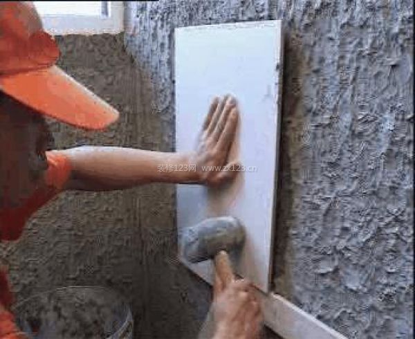 第二步:把滿批水泥的磚沿托板貼上墻,用橡皮錘敲打。