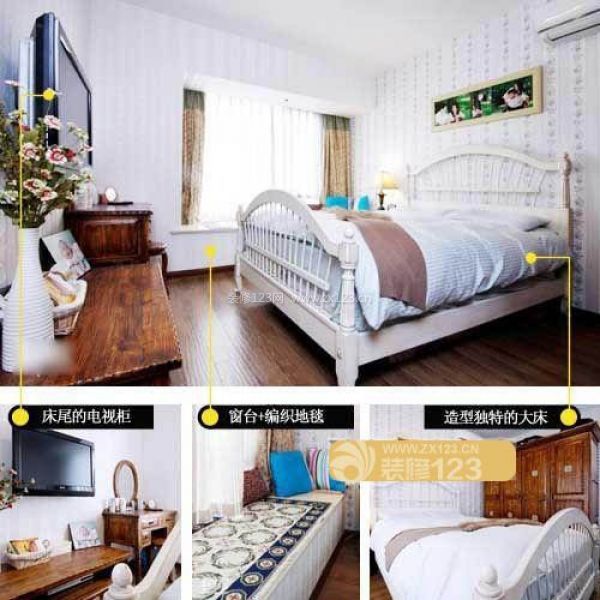 點評:來到了主臥,白色的墻面都被粉飾過。整體基本上都延續(xù)了白色搭配深色地板和木制家具的設計。主臥安裝有電視,方便主人躺在床上,舒舒服服地欣賞電視節(jié)目。飄窗鋪上了波西米亞風格的地毯,搭配上藍色的靠枕,真的很養(yǎng)眼。
