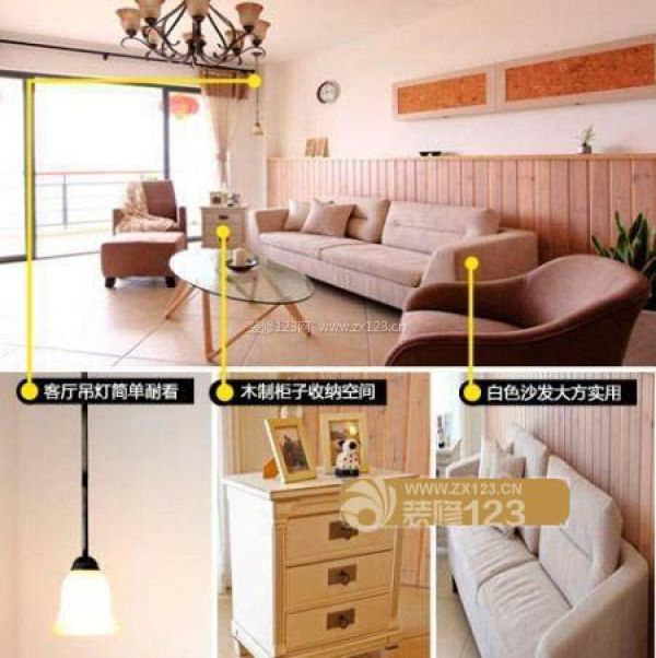點評:白色沙發(fā)跟米白色柜子色調相近,搭配起來不顯得突兀。沙發(fā)和吊燈款式簡單卻顯得大方,木制柜子安置在這里很實用,可以把一些雜物放在里面,而不至于使客廳雜亂無章。