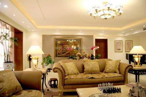 此款客廳設(shè)計具有濃烈的歐式風格特色,采用暖色調(diào)的沙發(fā)與沙發(fā)背景墻在色彩上形成完美統(tǒng)一,渲染出客廳的高貴與奢華,沙發(fā)背景墻上的兩幅精美裝飾畫,提升了客廳的歐式整體氣質(zhì),柔和燈光灑在沙發(fā)背景墻上時客廳的空間立體感得到完美呈現(xiàn)。