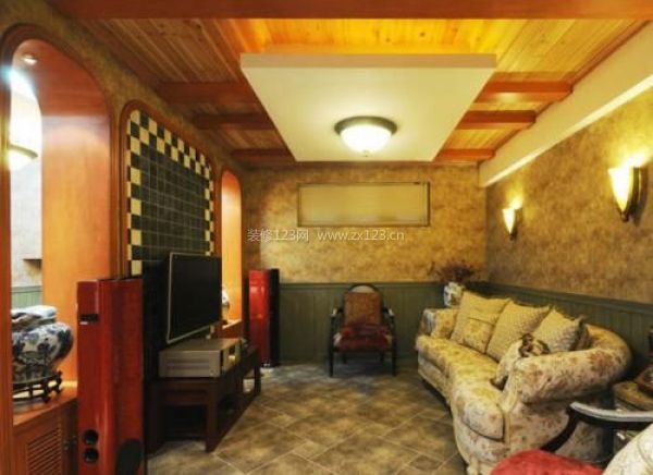 該客廳傳遞出美式風格的氣息,采用暖色調(diào)碎花圖案布藝沙發(fā)裝扮客廳,為客廳增添了溫馨氛圍,沙發(fā)背景墻采用暖色圖案的壁紙裝扮在柔和燈光的照射下,使客廳不僅增添了柔美感,同時也散發(fā)出客廳的高貴氣質(zhì)。