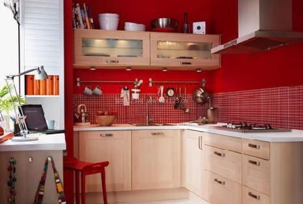 小戶型的廚房也是如此精彩,將顏色涂成靚麗的中國紅,張揚著美麗。靠窗的旁邊有一個小小的吧臺,它既是你的餐桌也是你的工作臺。在這里,可是一室三用了。