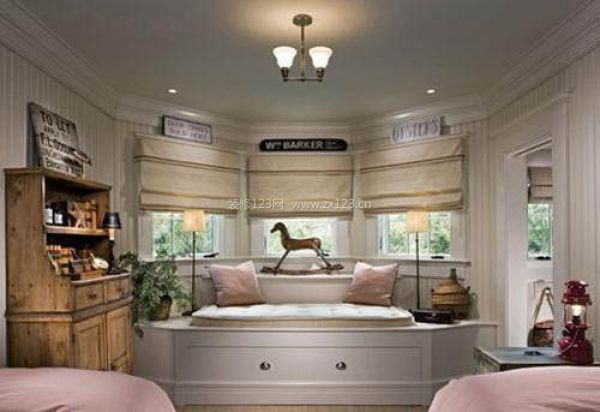 這個臥室的布置給人一種溫馨之感,飄窗設(shè)計將大量的光線引進室內(nèi),給這個空間形成了極好的采光,在飄窗上排放上軟榻,營造了愜意舒適之感。