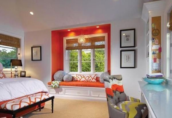 鮮艷的色彩能給空間增加活力感,這個飄窗選用和床品同色系的橙色,使房間整體風(fēng)格得到統(tǒng)一。飄窗的上方還掛上了別致的吊燈,營造了溫馨的氛圍。