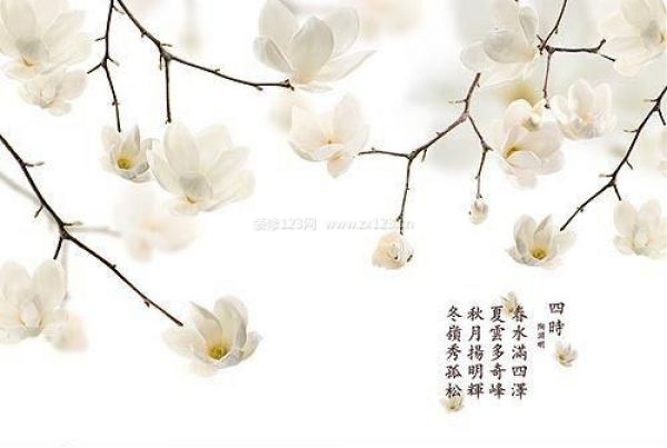 用傲雪凌霜的白梅作為畫面的主要元素,再題上陶淵明的《四時》詩,讓墻面顯得高雅大氣,充滿詩情畫意。