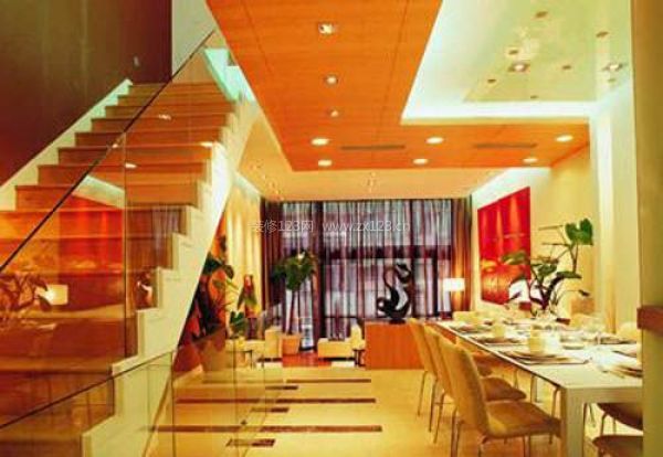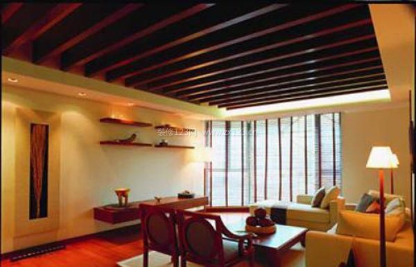 這款吊頂也屬于異性形吊頂,雖然它表面看是大平面為主,但仔細看,這個平面是由一組木制橫梁組成的。這種吊頂富有樸素大方并具有異域風情的特色,是小資一族所經常青睞的。該類吊頂一般用于客廳或餐廳等空間。