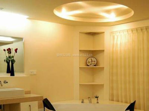 浴缸的上方,用一個與之呼應的圓形造型作為吊頂的主要設計符號。原本簡單的空間,在圓燈池里排列有序的燈光映照下,平添了幾分奢華與感性。