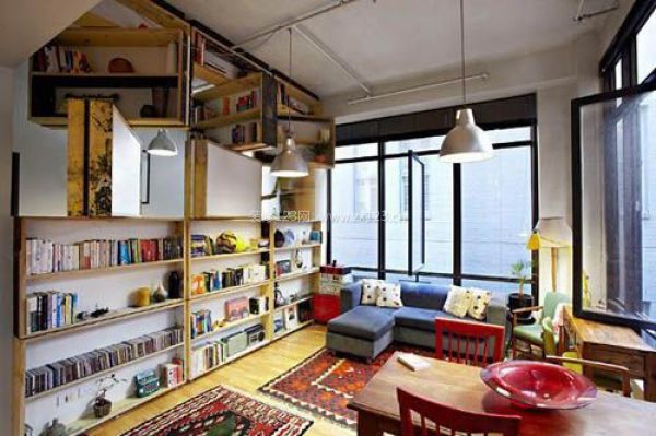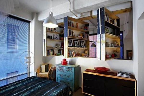 將書架完全轉到臥室這一邊,效果也非常好,不過為了兼顧臥室的裝飾需求,這幾面書架最好重點突出收藏品,因為在臥室擺放過多的書籍可能會造成空間的過渡壓抑。