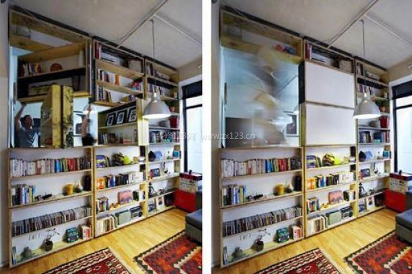 客廳的另一邊是臥室,書架旋轉過來后同時也可以滿足臥室的閱讀和裝飾需求。為了照顧臥室擺放家具的需求,設計師在設計這個書架的時候,并沒有將整面墻都打掉,而只是將墻面的上面部分做成了旋轉書架。如果你的家開間夠大,需要保存的書籍夠多,完成可以獨立做成整面墻的旋轉書架設計。 書架完成充當墻面,根據需求來選擇是將兩個空間開放還是閉合。