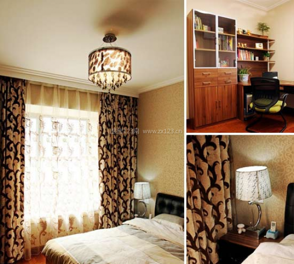 黑色的花紋配上金色的邊,展現高雅和華貴的結合。床品套裝卻采用暗綠的淺色花飾,同窗簾形成強烈的感覺對比,將現代的簡練和中式的古雅結合在一起,體現現代混搭風格的精髓。