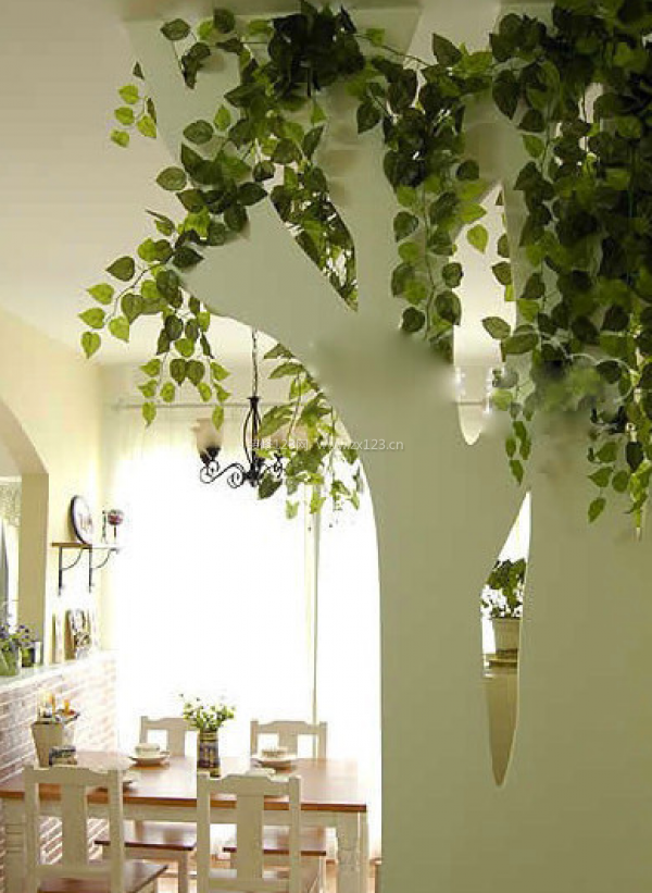 客廳餐廳一體裝修時候,木頭造型的隔斷墻,在上面掛上塑料了你也,讓家中綠意常在。
