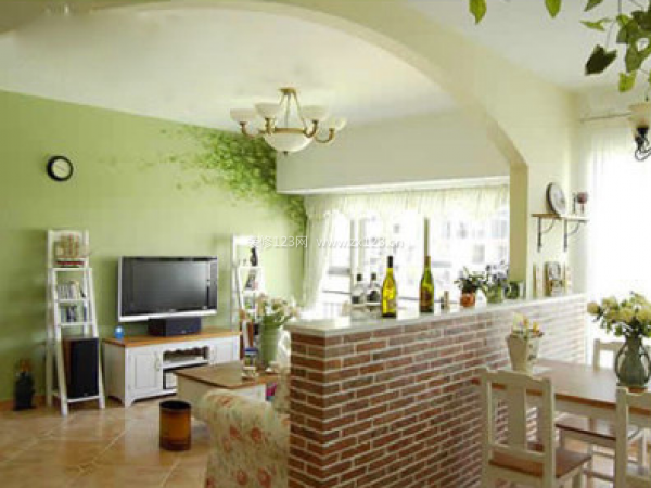 電視背景墻采用綠色粉刷。角落手繪長春藤葉子,翠綠的顏色不但能放松人的眼球,還產(chǎn)生仿佛家居在田田藤葉之中。半人高的隔斷,開放的空間產(chǎn)生空曠的視覺感。拱形的墻壁隔斷增加了客廳餐廳一體空間的連同視覺高點。