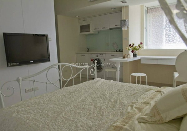 整體統一白色的墻壁和家紡可以在視覺上拉開距離。這種裝修色彩方案在小戶型裝修設計中經常看見。從這個角度可以大體上看到這個12平米小戶型裝修實例的容貌。