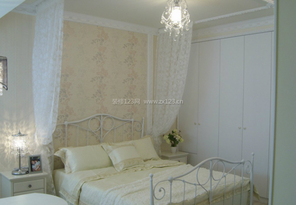 白色的家紡結合輕便的白色文紗,柔和的光通過水晶吊墜,讓這個床沐浴在溫暖的柔和燈光之下。里外一邊墻處、安置一排衣柜,可以容下臥室必備家紡和平時衣物。