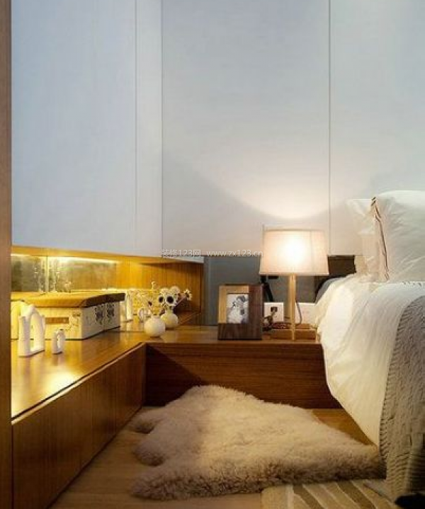 干凈整潔的白色加上原木風(fēng)味的木材,恰當(dāng)?shù)膶⒑?jiǎn)潔和日式風(fēng)格融為一體。床頭邊設(shè)計(jì)采用一段懸空的壁柜夾層,不但可以收納,還可以擺些裝飾等,在表現(xiàn)出創(chuàng)意的同時(shí),還大大增加了臥室的容物能力。