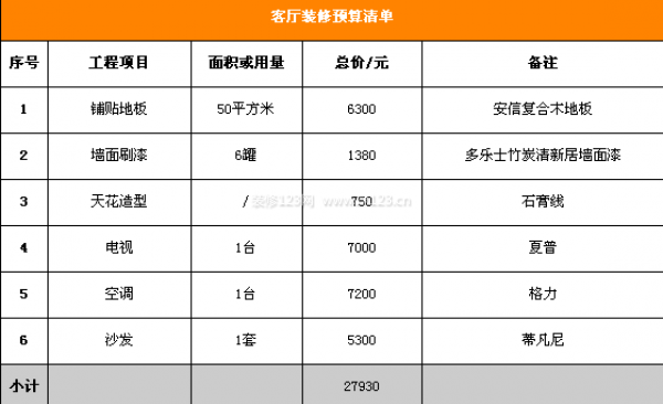 下圖是客廳裝修預算清單。