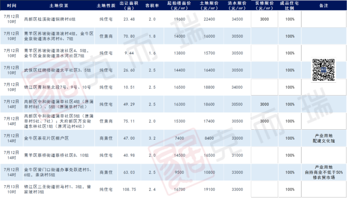 宗地位置:高新區中和街道蒲草社區5組(原蒲草村5社、7社);天府新區萬安街道東林社區1組(原河邊村4社),用地性質:住兼商用地,面積:50070.06平方米合75.1051畝,計容總建面:不小于50070.06平方米,且不大于100140.12平方米(其中兼容計容商業建筑面積比例不小于10%,且不大于21.7%),容積率:2,建筑密度:不大于25%成品住宅比例:100%,裝修限價:3000元/㎡,拍賣方式:“限房價、定品質、競地價”+抽簽,動竣工時間:土地交付之日起12個月內開工建設,自首次取得《施工許可證》之日起36個月內竣工,起拍價:15300元/㎡,土地限價:17400元/㎡,清水限價:30500元/㎡