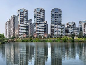 如何將原生態的溪谷風光,得到更大尺度的呈現。這一次,沁云灣面湖而立以50-100m參差不同的樓棟高度形成高低有序的溪谷至美天際線,仿若一片自然生長于溪谷的“天空之森”從林間低處的墅居視野升級成云端高處的俯瞰視野。離星空更近,擁山谷入懷輕云水色里,湖心映見家的倒影。