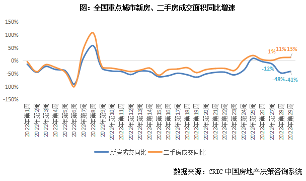 7月以來,二手房復蘇勢頭不減,并呈現出與新房迥異的走勢。2022年前26周,全國重點城市新房、二手房成交走勢基本保持同步,而第27周(6.27-7.3)開始,全國一二手房市場走勢出現明顯分化,新房成交同比由正轉負,且跌幅迅速擴大至40%以上,而二手房成交不僅沒有隨之步入負增長區間,同比增速還在逐周回升。