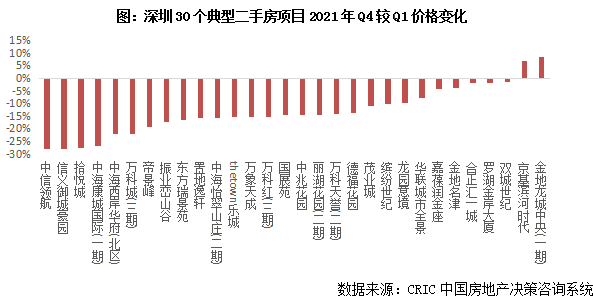 第二,房價持續下行,業主連番降價賣房并不鮮見。典型如深圳,指導價出臺后,二手房市場驟然降溫,成交均價自2月的7萬元/平方米左右,逐漸下跌至年末的6萬元/平方米。為了排除結構性因素對均價的影響,我們對比了30個成交量居前的項目一季度和四季度房價,結果顯示,九成以上項目可比價格負增長,七成以上項目降幅在10%以上,信義御城豪園、中信領航等價格下跌20%以上。