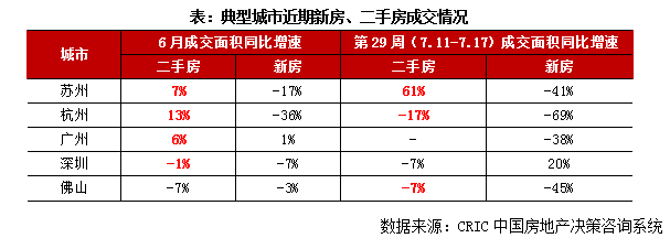 具體到城市,廣州、蘇州、杭州二手房市場已經逐步走出底部,6月二手房成交面積同比回正,7月復蘇進程未見明顯放緩,第29周,蘇州、杭州二手房成交面積分別保持在15.1萬平方米和10.5萬平方米的高位,蘇州甚至同比大漲61%。而反觀新房,6月年中沖量后漸顯疲態,第29周,蘇杭商品住宅成交面積同比跌幅都走闊至4成以上。
