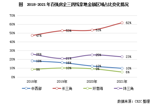 在三四線拿地金額分布的變化上,房企對(duì)不同區(qū)域的偏好程度出現(xiàn)了較大差異,投資結(jié)構(gòu)也發(fā)生明顯改變:自2018年以來(lái),房企在長(zhǎng)三角的投資占比持續(xù)增加,2021年長(zhǎng)三角區(qū)域的占比達(dá)到62%,較2020年增加9個(gè)百分點(diǎn),較2018年更是大幅提升15個(gè)百分點(diǎn)。