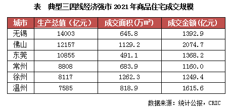 這些城市商品住宅市場(chǎng)成交規(guī)模亦處于同能級(jí)前列,其中佛山得益于廣佛同城帶來(lái)的大量需求導(dǎo)入和購(gòu)買(mǎi)力支持,其成交金額更是達(dá)到了2074億元,超過(guò)了合肥、長(zhǎng)沙、濟(jì)南等二線城市。無(wú)錫、東莞、常州等城市2021年下半年市場(chǎng)成交熱度雖大幅降溫,但在大規(guī)模的經(jīng)濟(jì)體量之下,城市的住宅需求總量依舊處于三四線前列,全年的商品住宅成交金額仍可保持在千億水平以上。