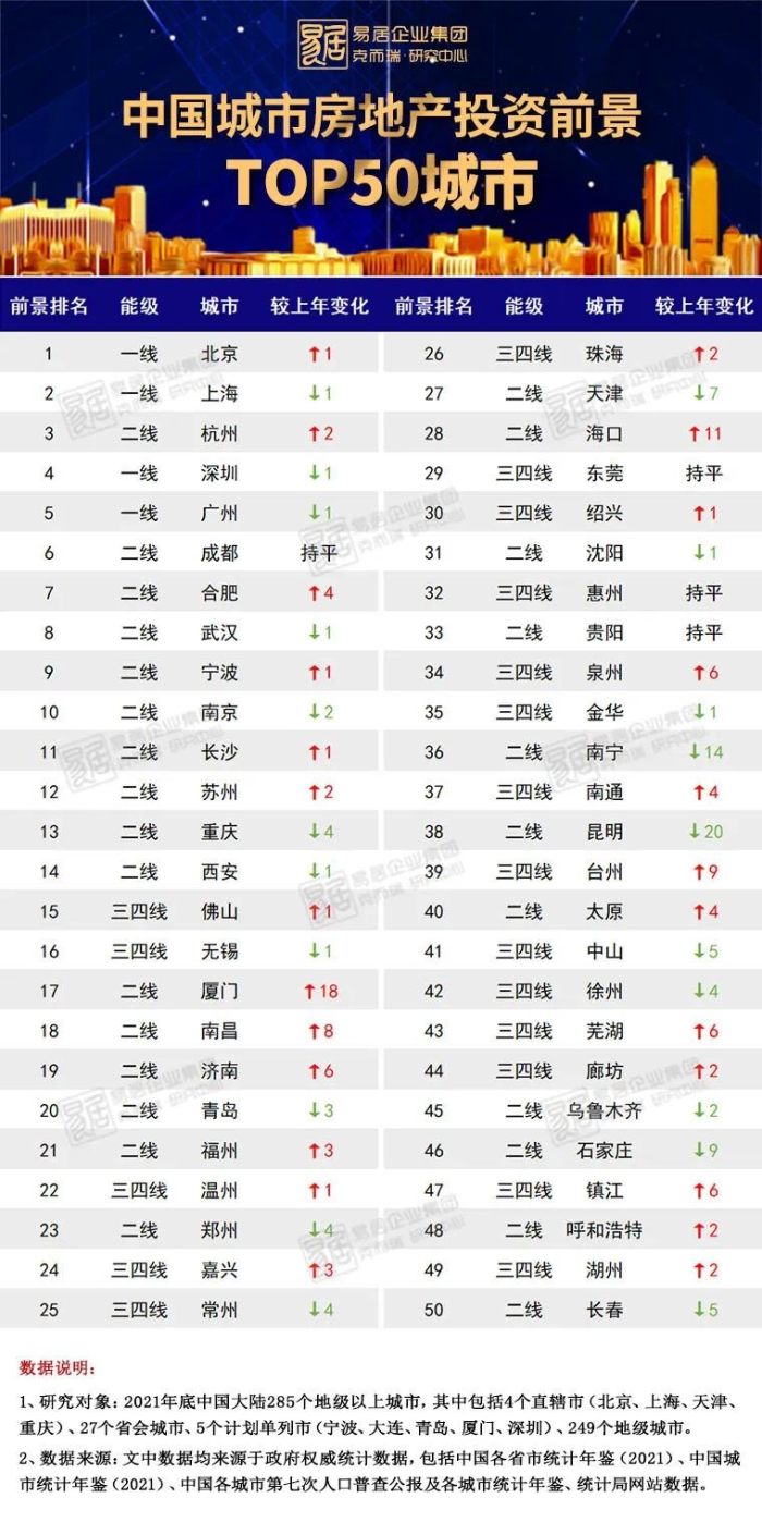 2022年,CRIC研究中心在歷年的研究基礎(chǔ)之上,繼續(xù)將研究對(duì)象覆蓋全國(guó)285[1]個(gè)地級(jí)以上市,并且新增GDP增長(zhǎng)、七普后人口發(fā)展等指標(biāo),將最新城市數(shù)據(jù)進(jìn)一步更新到2021年,同時(shí)更完善了分析方法,綜合運(yùn)用因子分析、相關(guān)性分析、回歸分析、Ahp層次分析、德?tīng)柗品ǖ榷喾N數(shù)學(xué)工具,對(duì)房地產(chǎn)市場(chǎng)前景進(jìn)行定量化研究,對(duì)不同城市能級(jí)的前景來(lái)源予以剖析,并對(duì)前景較優(yōu)城市的指標(biāo)特征進(jìn)行歸納總結(jié)。全文主要結(jié)論有以下五點(diǎn):
