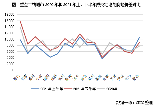 在拿地成本下降的背景下,多數(shù)城市的房?jī)r(jià)保持穩(wěn)定,部分限房?jī)r(jià)的城市如杭州、成都、長(zhǎng)沙、寧波等還在第三輪集中供地中進(jìn)一步上調(diào)了商品住宅銷(xiāo)售限價(jià),房地價(jià)差空間被進(jìn)一步擴(kuò)大。17個(gè)城市中,約七成的城市在2021年下半年成交涉宅地的房地價(jià)差明顯高于上半年,僅長(zhǎng)沙、青島等少數(shù)城市因成交結(jié)構(gòu)更偏向房?jī)r(jià)較低的郊區(qū)而導(dǎo)致房地價(jià)差空間縮小。再與2020年相比來(lái)看,仍有過(guò)半的城市在2021年下半年的房地價(jià)差水平超過(guò)2020年,利潤(rùn)空間明顯擴(kuò)充。