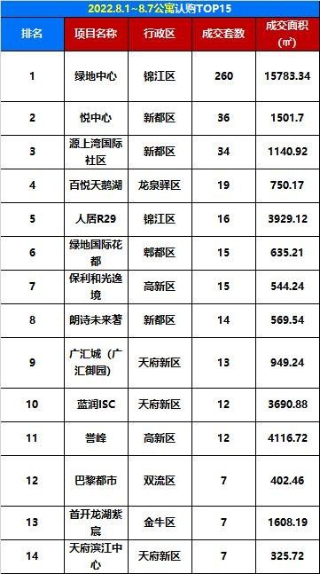 8月17日成都公寓銷量TOP3榜單看點: