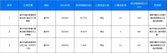 崇州市第3宗土地出讓時間為2022年8月2日,土地位置位于崇州市崇陽街道毛橋社區三組、白石村十六組,凈用地面積為7.5406,土地競得者為成都市蜀州興宇城市建設有限責任公司(崇州國資委),成交樓面地價為812元㎡。土地用途依舊為商業用地。