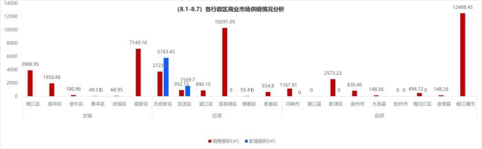 據有關數據顯示,8月1日-8月7日,成都商業市場錦江區等主城銷量大漲,天府新區等近郊供銷雙降,都江堰等遠郊銷量穩居上升。上周(8.1~8.7)亮點為都江堰區域銷售面積直線上線,成功“出圈”,具體如下: