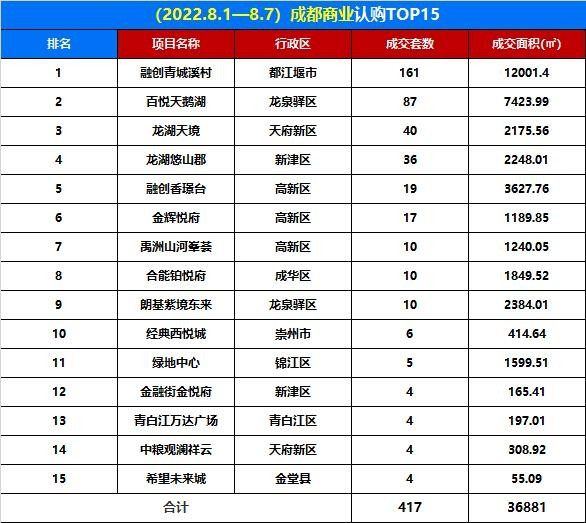 據(jù)有關(guān)數(shù)據(jù)顯示,2022年8月1日8月7日,成都商業(yè)TOP15銷售共計(jì)3.68萬㎡,其中包括融創(chuàng)香璟臺(tái)、金輝悅府、禹洲山河峯薈、合能鉑悅府、朗基紫境東來、綠地中心主城5個(gè)樓盤;天鵝湖、龍湖天境、朗基紫境東來、中糧觀瀾祥云近郊4個(gè)樓盤;融創(chuàng)青城溪村、龍湖悠山郡、經(jīng)典西悅城、金融街金悅府、青白江萬達(dá)廣場(chǎng)、希望未來城遠(yuǎn)郊6個(gè)樓盤。值得一提的是,融創(chuàng)青城溪村、百悅天鵝湖、龍湖天境被購房者深受喜愛,一躍成為榜單前三位,具體如下: