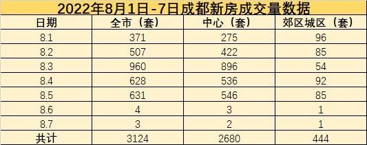 據(jù)數(shù)據(jù)顯示,2022年8月1日7日,成都新房成交量共計為3124套,中心區(qū)域為2680套,郊區(qū)城區(qū)為444套。