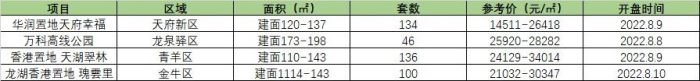 八月已悄然過半,樓市銷量穩居上升。據數據統計來看,成都8月8日8月14日共計有6個項目開盤,共計719套房源。目前較有熱度樓盤有4個,分別為天府新區 華潤置地天府幸福、龍泉驛區 萬科高線公園 、青羊區香港置地 天湖翠林、金牛區 龍湖香港置地 瑰雲里,具體情況如下: