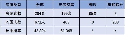 此次搖號房源總房源為284套,類型分為三類,一為無房家庭、二為棚改、三則是普通遞補,分別為無房家庭199套、棚改58套;搖號入圍人數共計671人,其中無房家庭入圍人數占據主要為463人,另外,普通遞補則為208人。