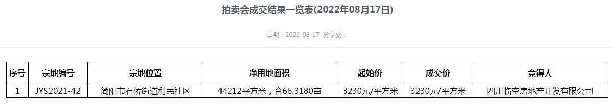 四川簡(jiǎn)陽(yáng)市石橋街道利民社區(qū)1宗商住地成功出讓,被四川臨空房地產(chǎn)開發(fā)有限公司摘得,成交價(jià)約3.57億元,成交樓面價(jià)3230元/平方米。