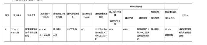 成都新津出讓1宗國有建設用地使用權,宗地位置:花源街道牧馬山社區(qū)四組,編號:XJ2022-07(0901) 商業(yè)用地 40年