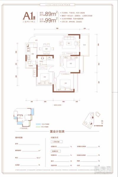 A1戶型(3室2廳,89平,南北)