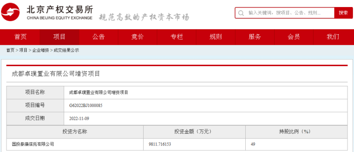 據北京產權交易所消息,“成都卓璞置業有限公司增資項目”已于2022年11月9日成交,國投泰康信托有限公司以9811.716153萬元成為投資方,持股比例為49%。